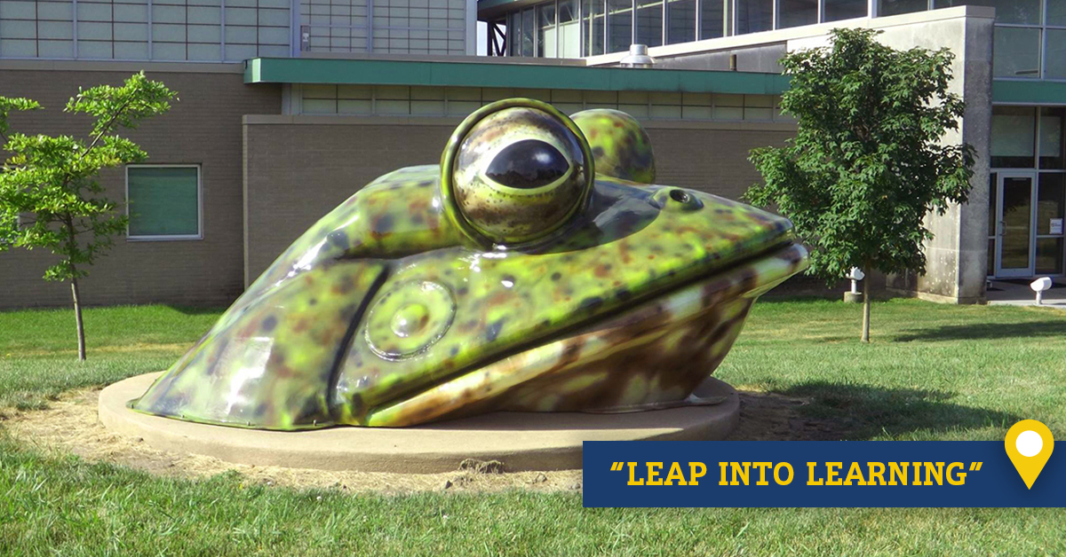 Inside the library, there’s a rotating art display keeping things fresh, so every visit feels a little different. Step outside and you’ll spot the Leap into Learning statue, which is basically an open invitation for kids to climb, pose, and practice their froggy “ribbit.”