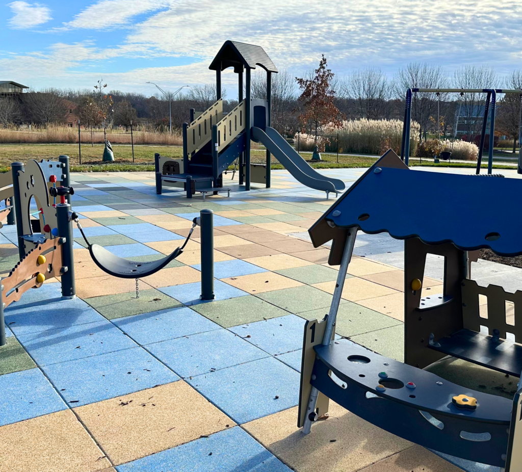 Ashawa Park also has many features that target 2-5 year olds. Several sensory panels, a playhouse and a larger 2-5 year old traditional structure. Toddlers will also love the four seat bouncy ride. (Parents of littles will want to watch their kids on the tower playground because there is one spot where there is a 6ft drop where you will want to keep an eye on an unaware toddler.)