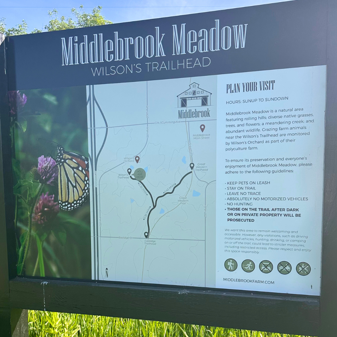 The trail through the meadow connects the Great Western Trail and Wilson’s Orchard & Farm. There are three trailheads in the meadow. The Great Western Trailhead is accessible by the Great Western Trail; there is no parking near this trailhead. We parked along the second trailhead, the Coolidge Trailhead, on the gravel road to explore the meadow.