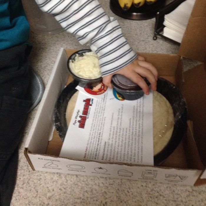 Last night we attended our very first school conferences for our kiddos. Since our scheduled time was right during dinner time we had to come up with a quick easy meal to fix when we got home. So I asked my wife to pick us up a pizza before hand at Papa Murphy’s. I had heard that they now had a Gluten Free (my wife can only have Gluten Free) crust and figured this would be a good time to give it a try. 10 minutes later I get a text with a picture of a small kid’s pizza kit and a message that she found a fun activity for the kids to go along with dinner. A pizza kit for kids? What a great idea! For only $4.00 a piece, the Mini Murph Pizza kit comes with: