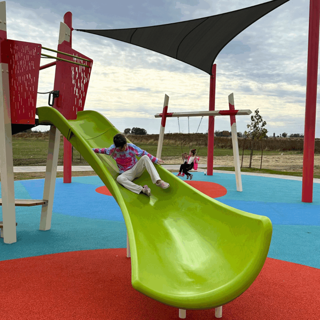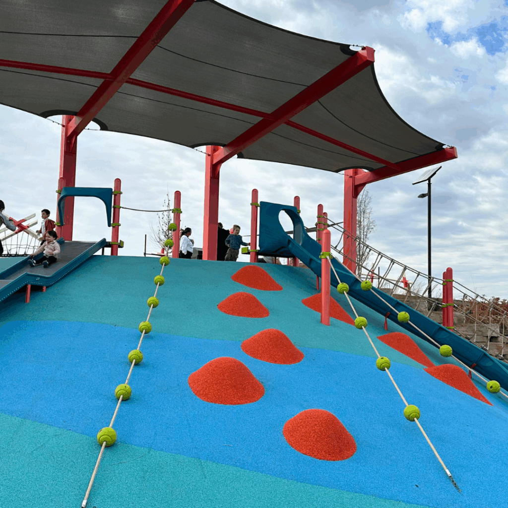 On top of the hill, there are four different structures that give space for kids to climb and explore. The belt climber to the wide mouth slide is perfect for the thrill seeker who loves slides. The fortress multi climber is a place for kids to test their climbing skills and tackle new climbing challenges together. Preschoolers to tweens will find ways to challenge themselves on this equipment.