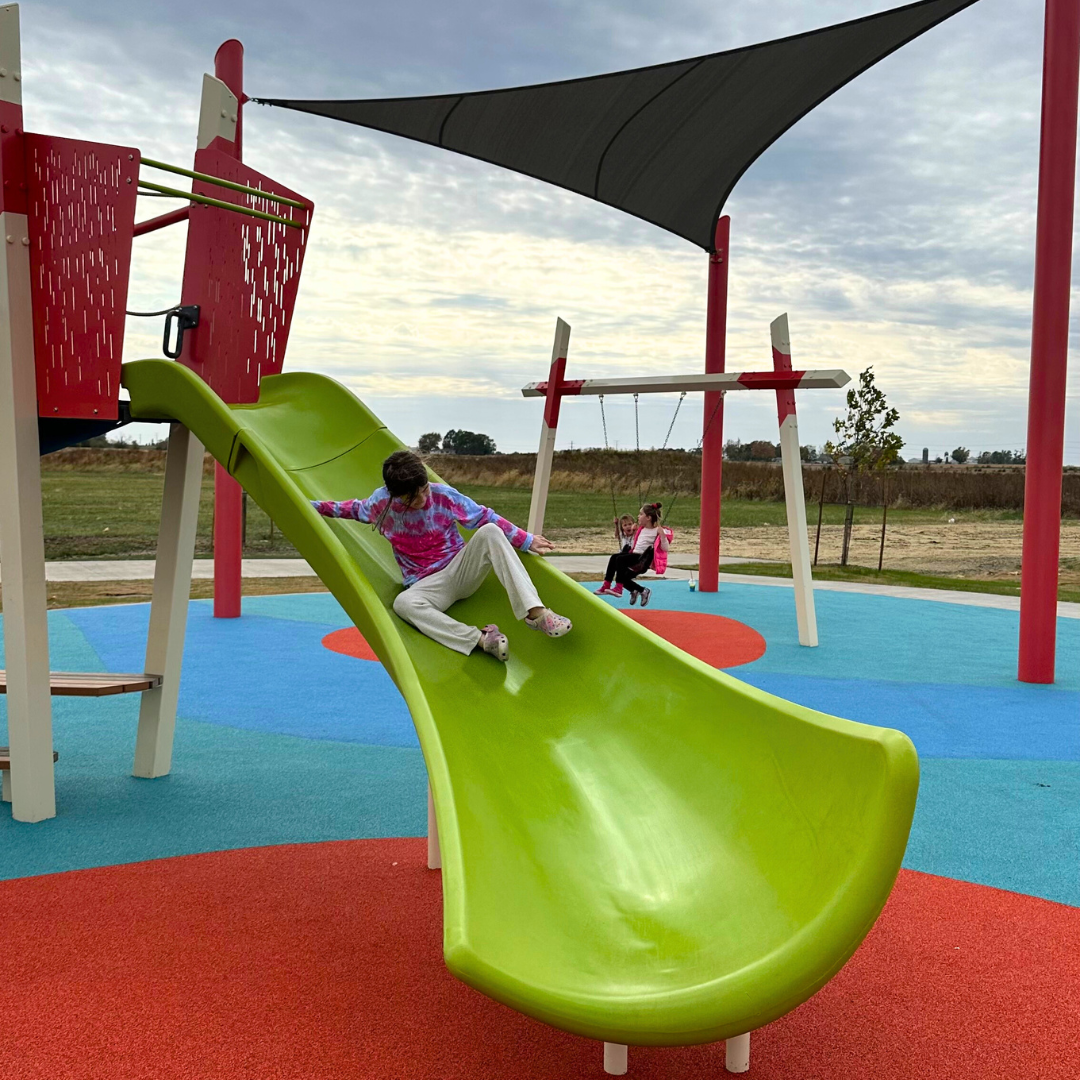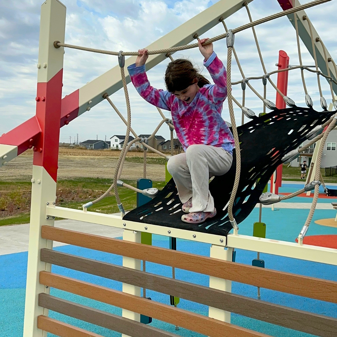 Waukee’s newest park is absolute gold! Spring Crest Park immediately will pull your kids in. This park features a hillside playscape that will keep kids of all ages engaged! My kids absolutely loved the giant roller slider! It was so fun to see all of the different ways they slid down and climbed up the hill through all the different ropes, boards, and knolls.