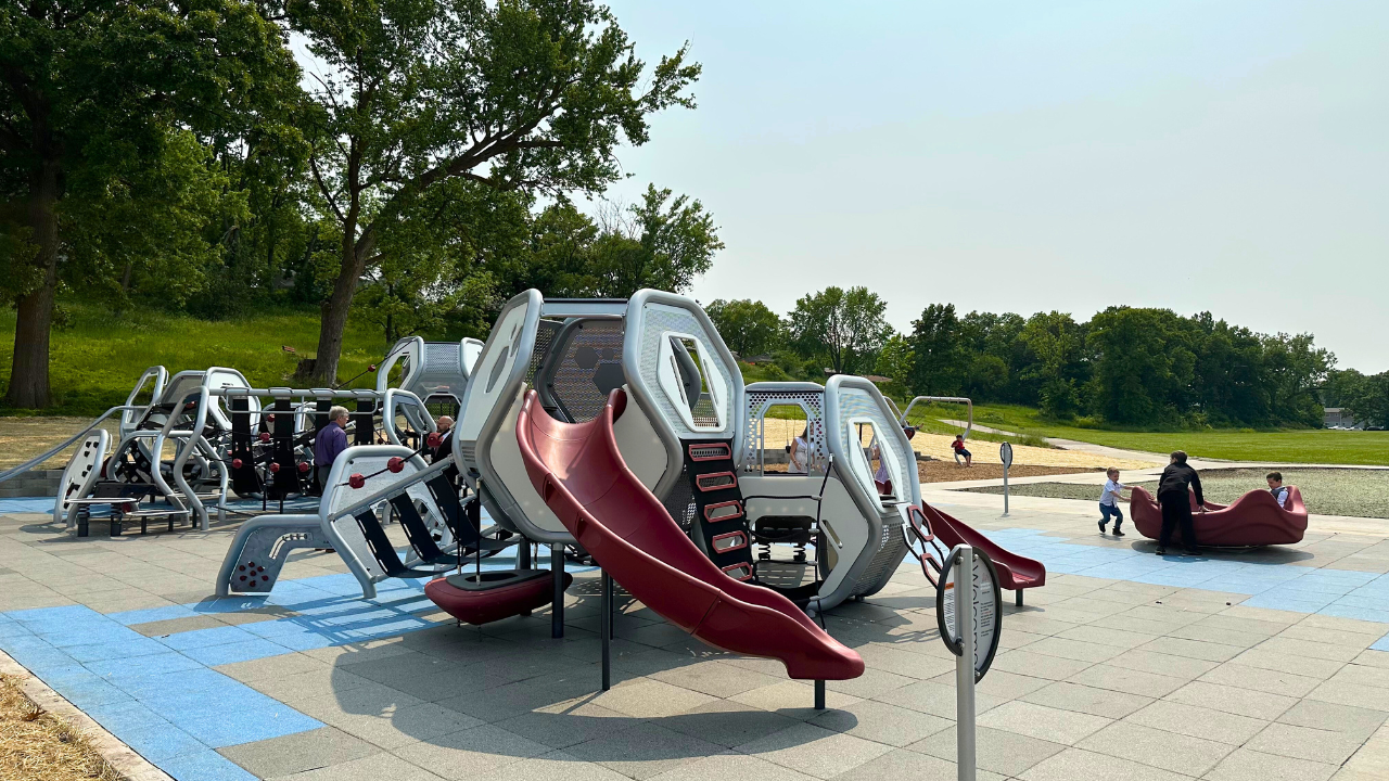 Stone Park is a stunning new park AND sprayground in Des Moines, Iowa! This playground offers two eye-catching geometric playground structures that invite kids of all ages and abilities to crawl, climb, and slide through. One structure is perfect for 2-5-year-olds–low to the ground but still offering the invitation to explore. The larger structure is filled with belts, unique climbing steps, and hiding spots. My kids have a unique play experience every time they come to this park because this structure encourages it. (Also, my kids loved pouring water down this slide when no other kids were at the park! It made the perfect water slide!